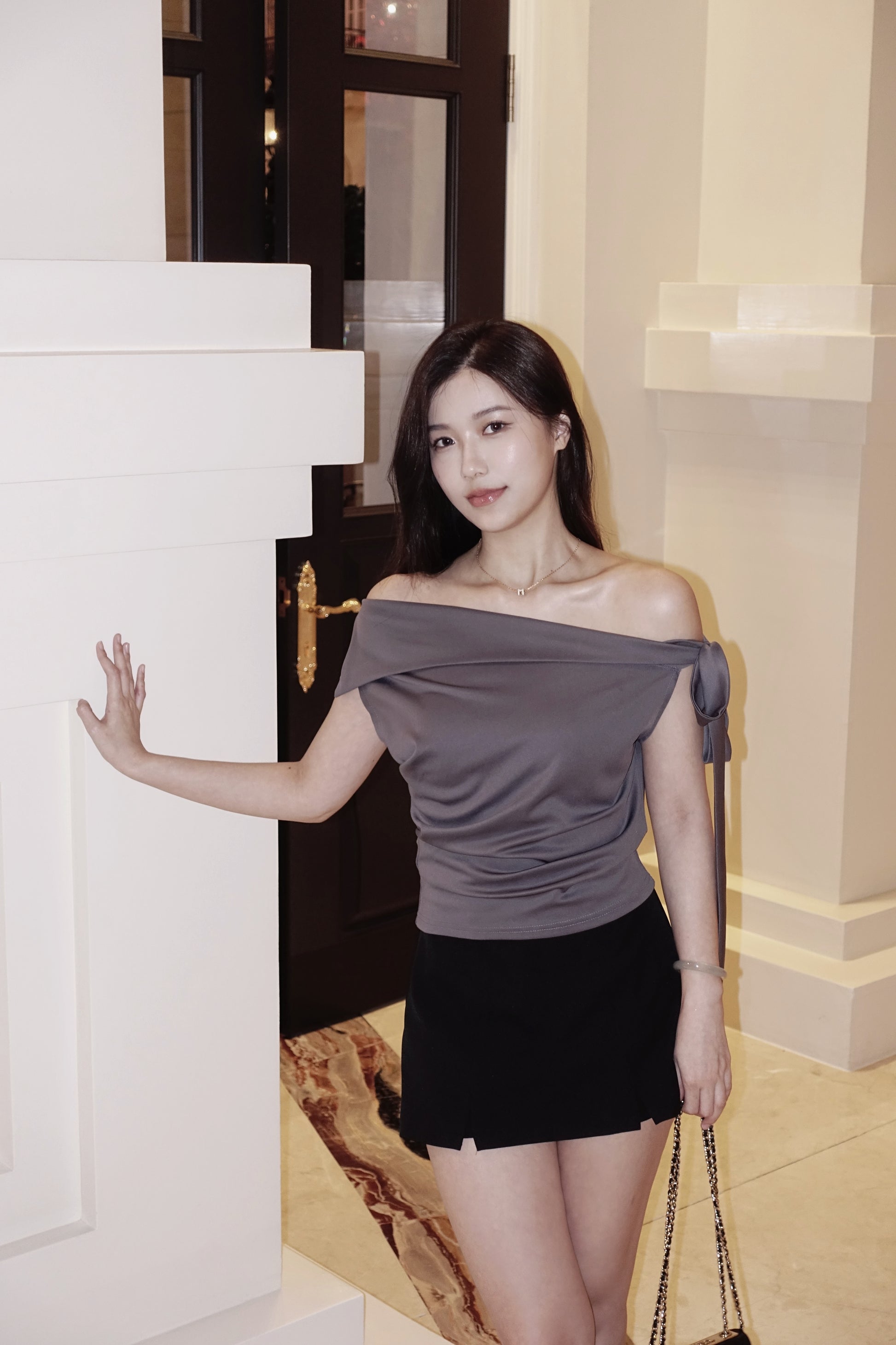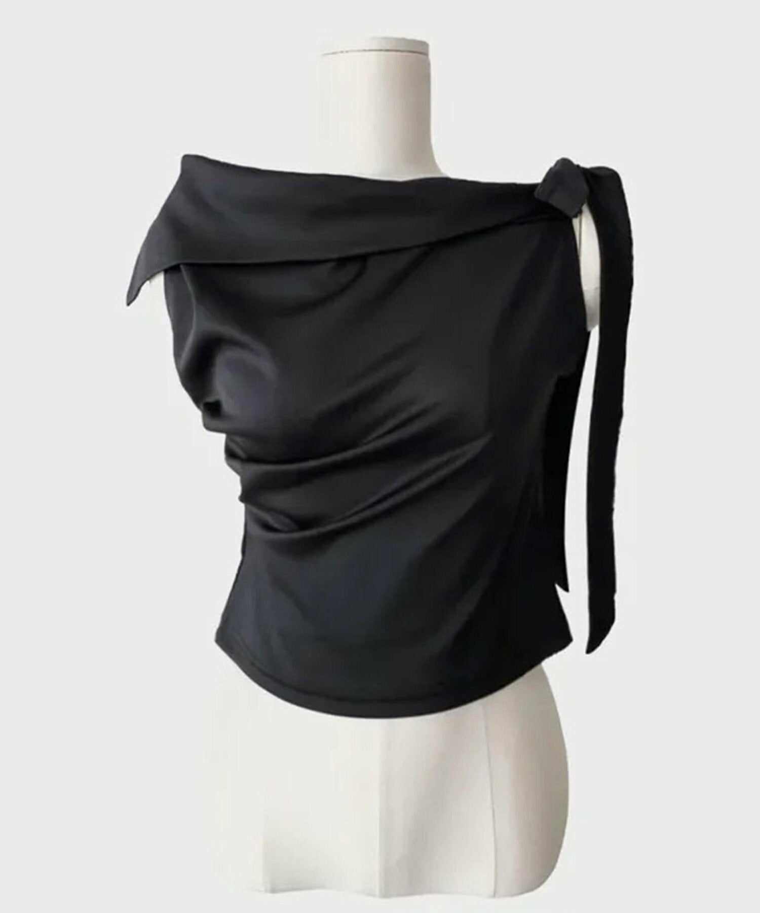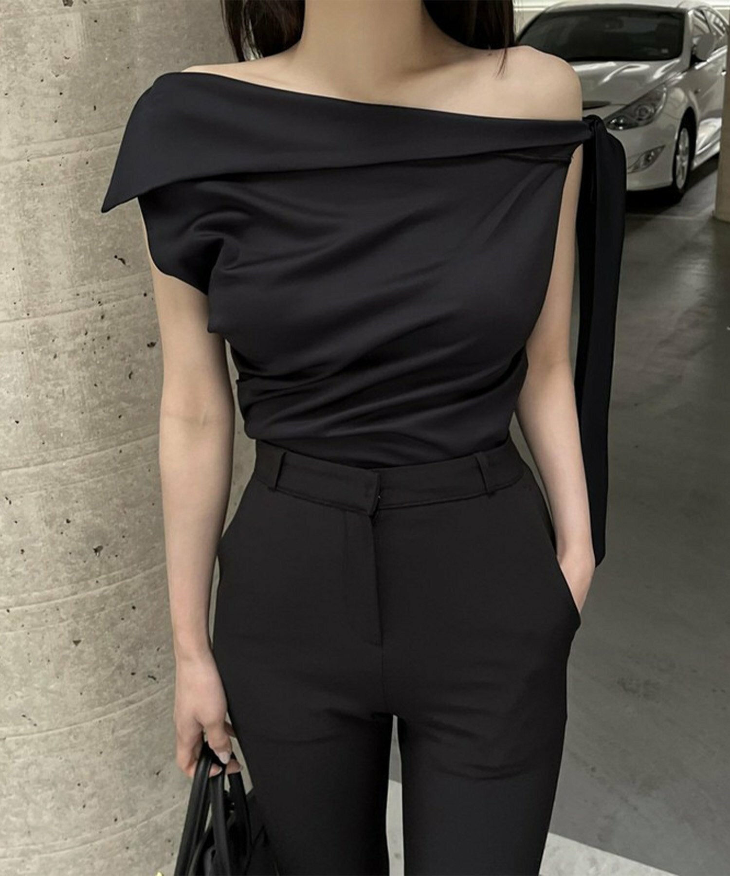 Korea高級感緞面露膊綁結上衣