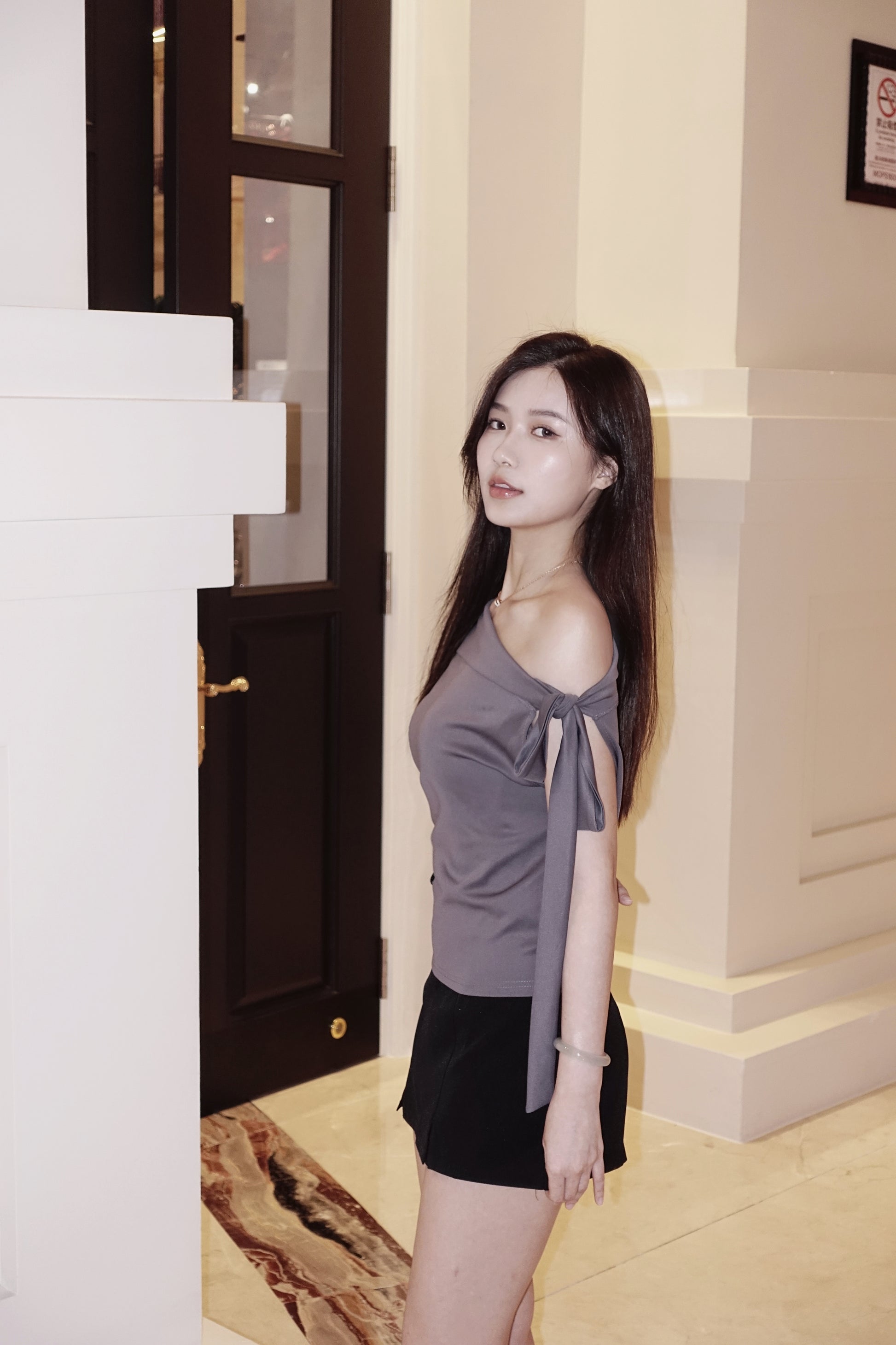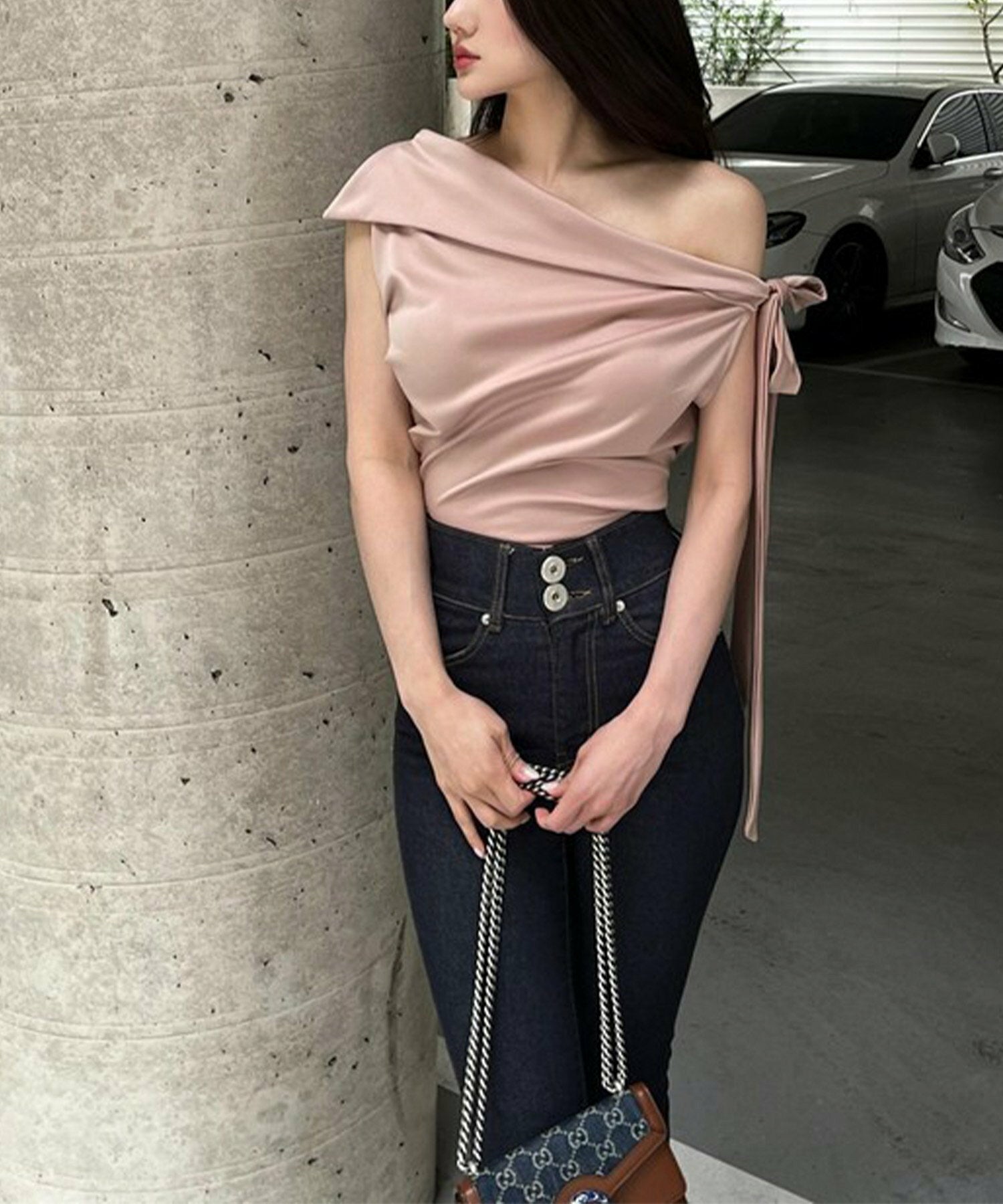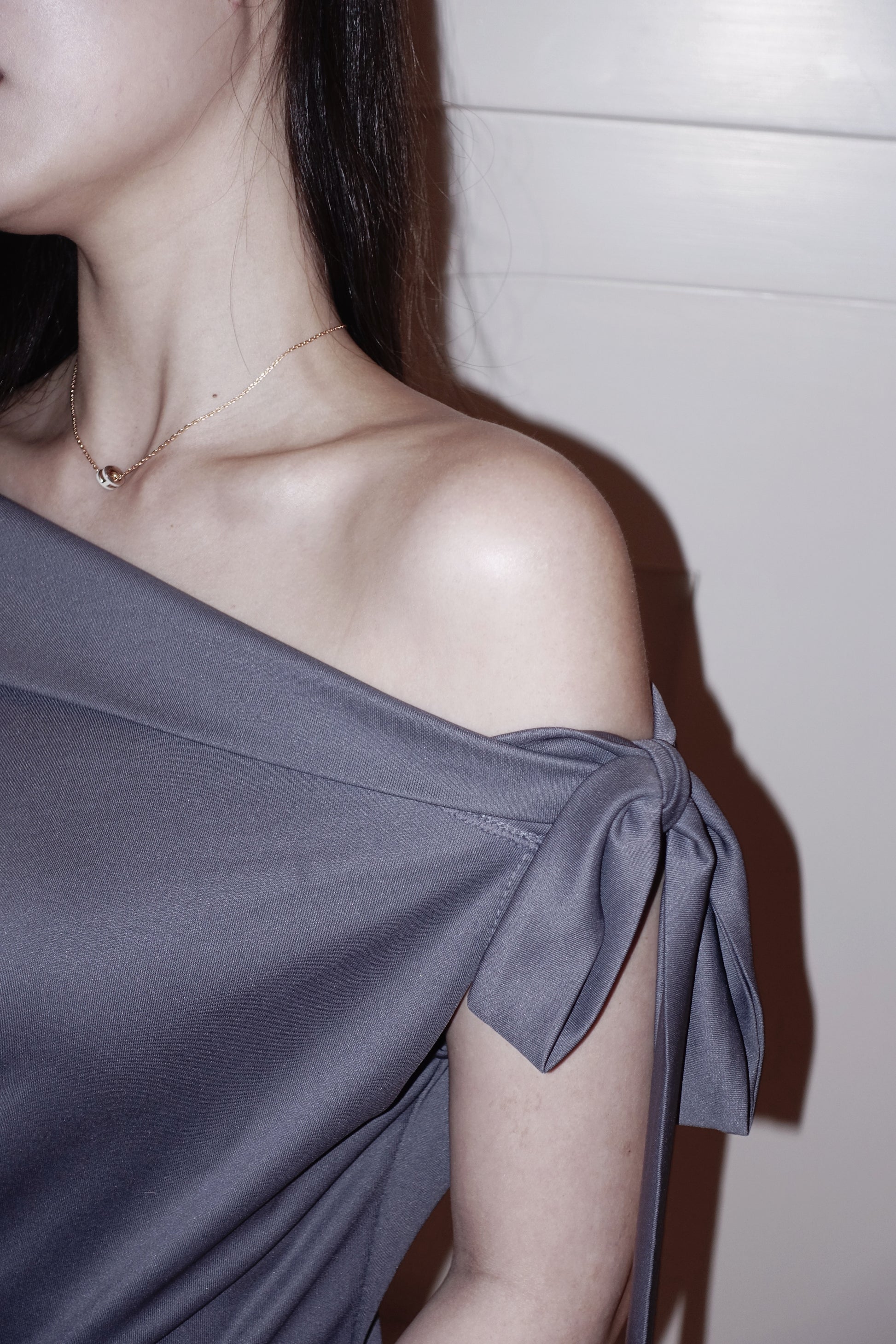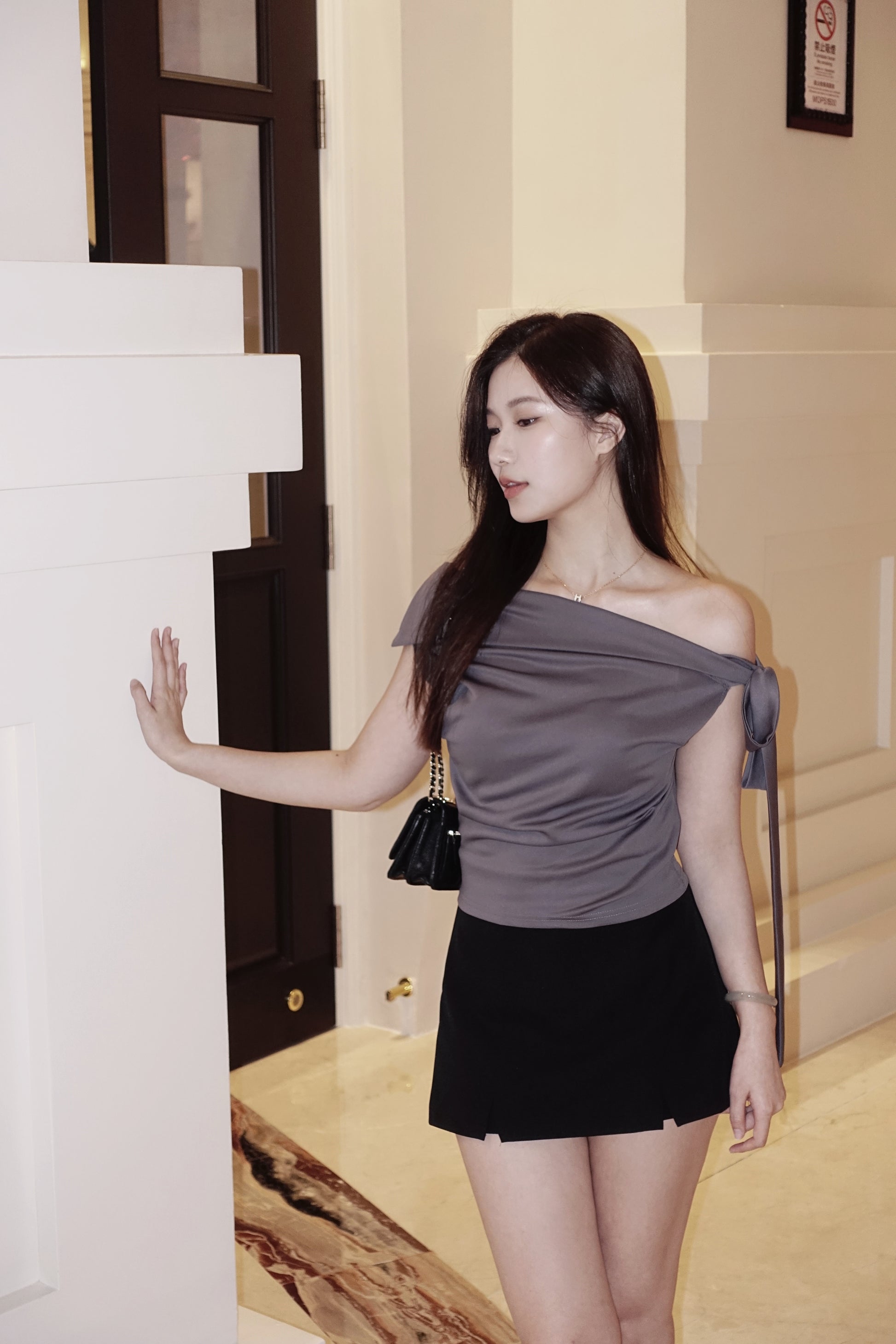 Korea高級感緞面露膊綁結上衣